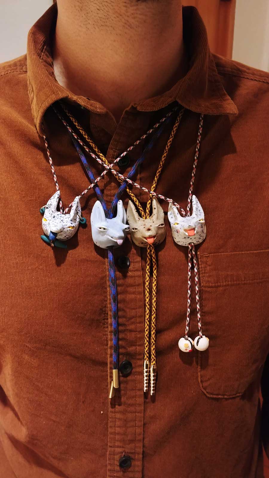 She makes many types of pottery – cups, pitchers, etc.– but her bolo ties really caught my eye. The centerpiece (where in Native American culture you’d usually see some intricate silver and turquoise design intersecting a leather cord) is the head of a dog.
