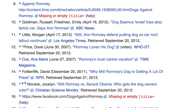 Here’s the background. About a month ago, I wrote a post on the incident of Mitt Romney and his Irish Setter, Seamus. The basic story is that Romney, then a presidential contender, was criticized for having two decades earlier put his dog, Seamus, in a dog carrier and strapped it to the top of his car for a 12-hour drive from Massachusetts to Canada. I was bothered by a few details left out of the incident’s Wikipedia page, so I added two sentences to the mix in different paragraphs. One sentence (in red) When interviewed by Chris Wallace of Fox News, Romney stated that Seamus enjoyed being in the dog carrier, an “air-tight kennel”, and that he was not aware of any violations of Massachusetts law,[8] even though the state’s animal cruelty laws specifically prohibit anyone from carrying an animal “in or upon a vehicle, or otherwise, in an unnecessarily cruel or inhuman manner.”[