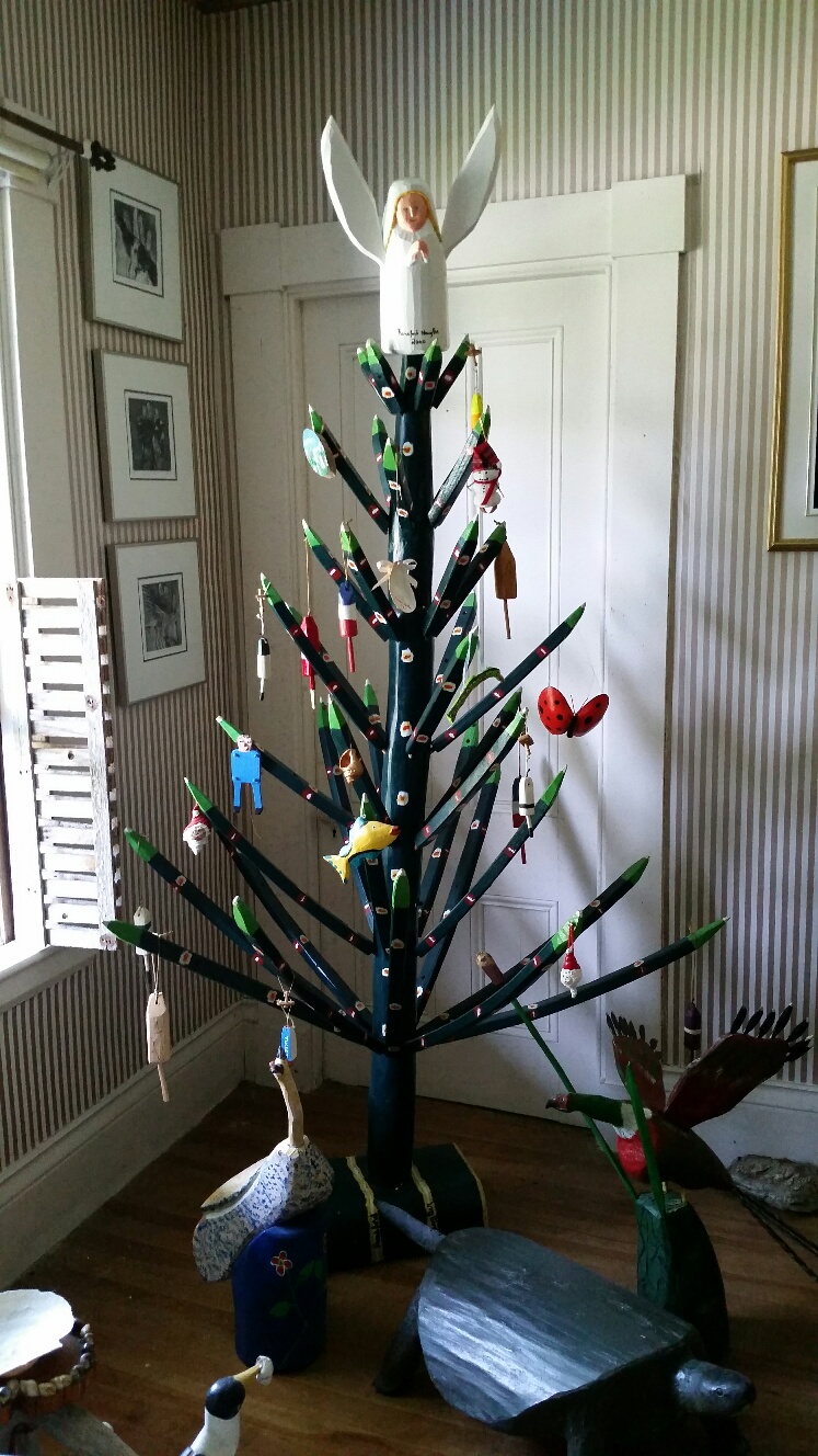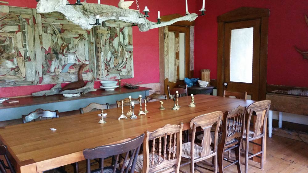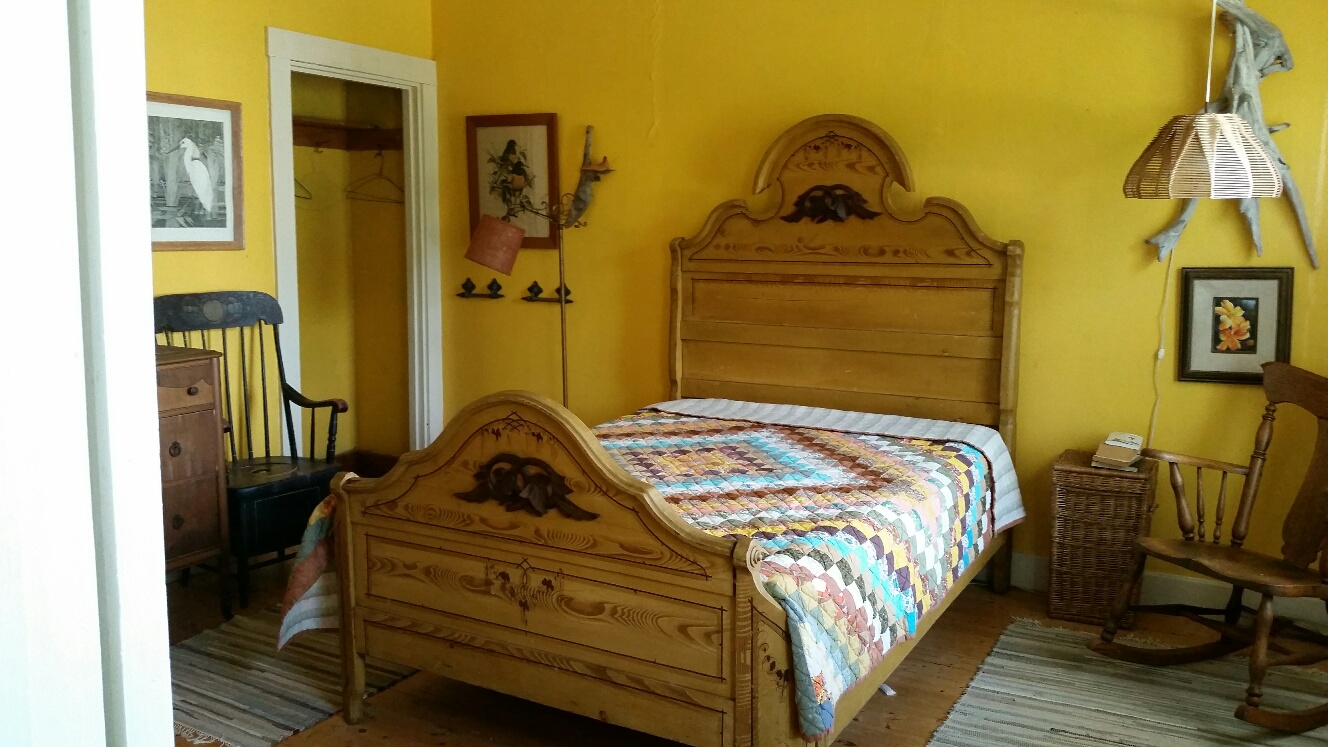 Inside, Clayton’s house is colorful and sprawling, with ample bedrooms and hallways in which to avoid all others if you so wish. Each nook and cranny holds a new surprise. From a bathtub filled with brightly painted wooden sea creatures to a display of  colored glass bottles reflecting primary colors onto the nearby walls. From the Naugler folk art Christmas tree standing year-round in a corner to the bright yellow bedroom with complimentary patchwork quilt.